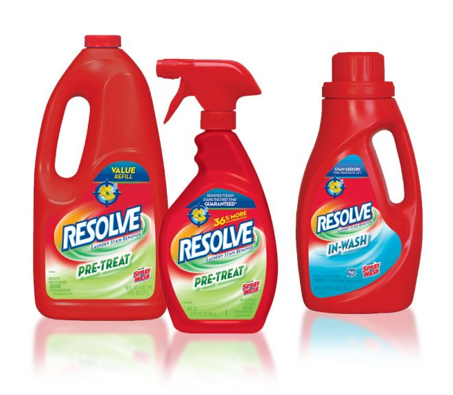 Background: As part of the migration from Spray ‘n Wash to Resolve, the brand team was mandated to convert all of their packaging currently in Spray ‘n Wash Green to Resolve Red. While the transition to all red bottles unifies the products at shelf to create a strong brand block, research showed that an all-red portfolio would also cause significant confusion among consumers as they try to find specific products. Since cost would not allow bottle shapes or color to be altered to differentiate product lines and products, the brand needs packaging to be reliant on the artwork to clearly communicate both the brand and the specific product identity while still being eye-catching in a crowded shelf set.