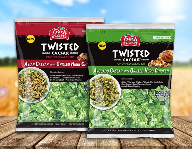 Background: Redesign of existing Twisted Caesar category packaging adding chicken for a specific well known retail customer. Package design needed to look premium to support price point and differentiate from existing Twisted Caesar category.